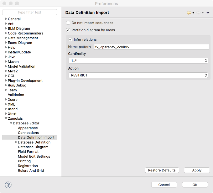 Data Definition Import preferences sets the default values and options to be used for database import wizards, both from a data definition file and from an OpenEdge project.