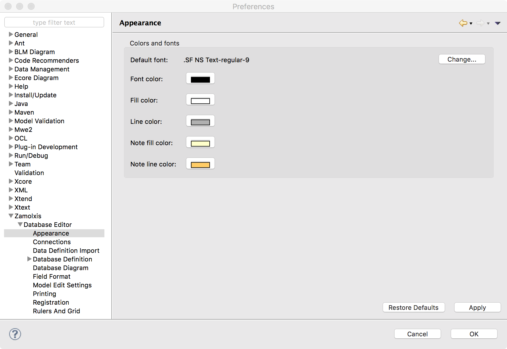 There are a number of preferences that can affect how the ERD editor looks and perform certain actions, those are grouped in different pages under Zamolxis category.