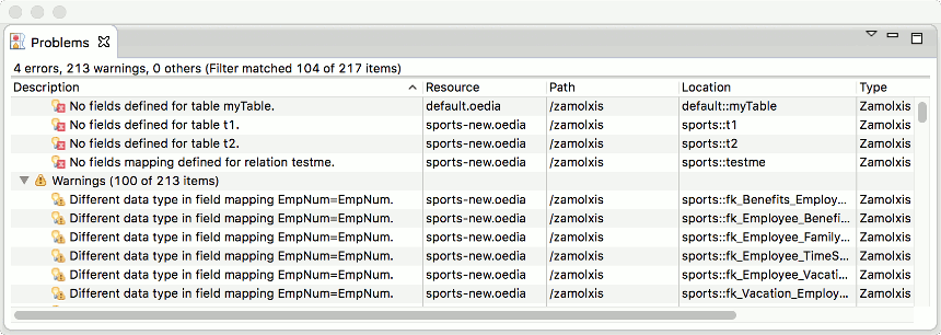 The Problems view is a generic Eclipse view that can be used to visualize validation errors and warnings, those can show all problems found in the workspace, current project or only for selection.