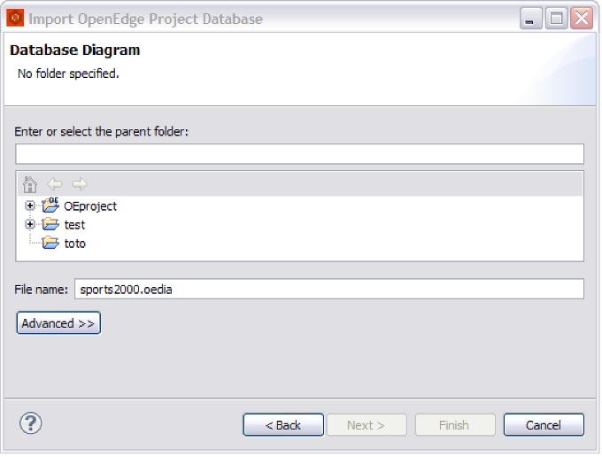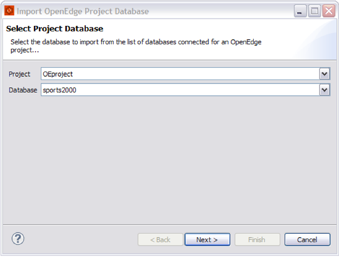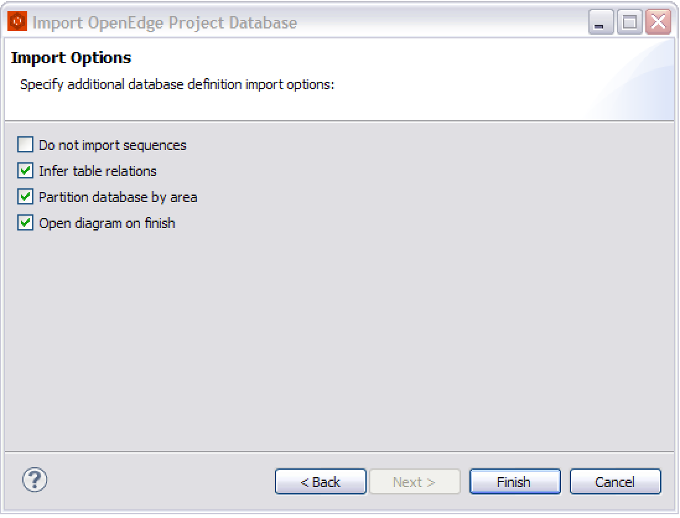 This wizard helps you import a database model from one of the databases configured for an OpenEdge project by creating a new OpenEdge database diagram or updating an existing database diagram in the workspace.